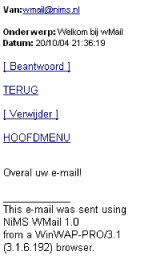 !--#layout hosting --!/!--@ !--#titel --!wMail - e-mail op uw mobiele telefoon/!--@ !--#tekst --!Onze klanten willen graag bereikbaar zijn. E-mail is daarbij nog steeds een belangrijk communicatiemiddel. Onze dienst wMail brengt de e-mailbox naar het mobiele toestel. Elk mobiele toestel dat gebruik kan maken van WAP diensten (bijvoorbeeld via KPN i-mode of Vodafone Live!) is geschikt voor NiMS wMail.